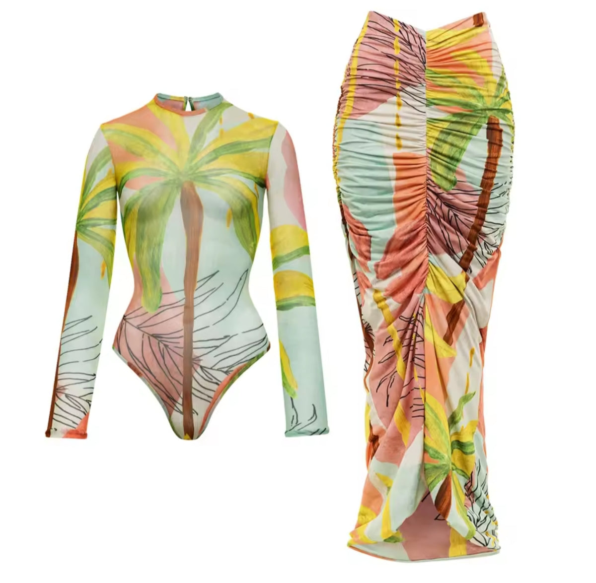 Ensemble deux pièces ultra tendance : body manches longues à imprimé palmiers et jupe longue drapée assortie. Un look tropical chic parfait pour briller en vacances ou en soirée