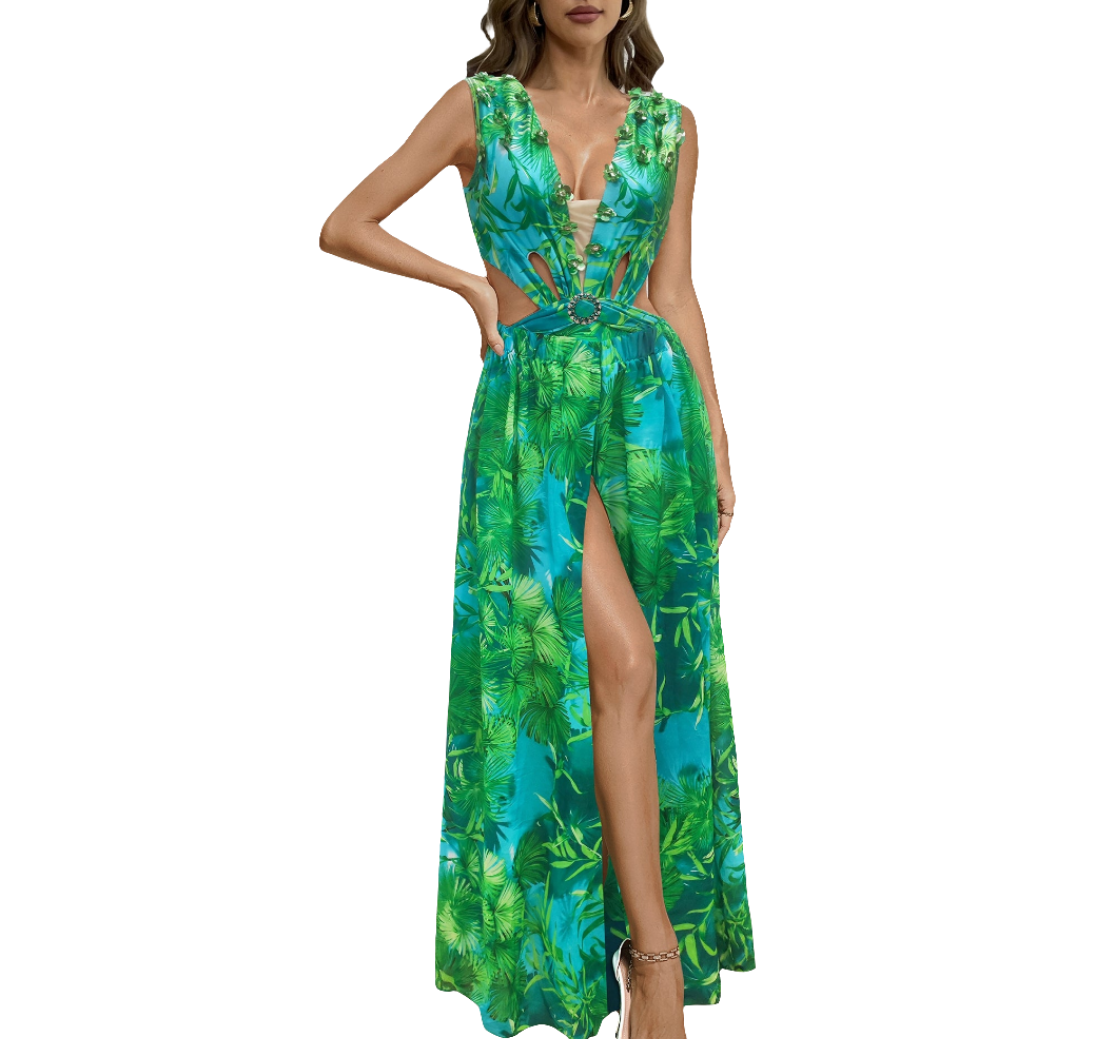 Ensemble deux pièces tropical chic, composé d’un maillot une-pièce plongeant orné de fleurs et d’un bijou central, accompagné d’une jupe longue fendue assortie. Un look glamour et lumineux, parfait pour briller à la plage ou en soirée estivale.