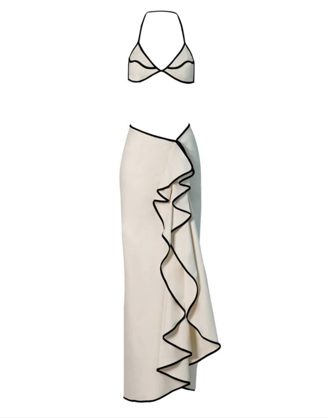 Ensemble deux pièces chic et minimaliste, composé d’un bikini triangle raffiné et d’une jupe longue fluide à volants. Un look blanc éclatant aux bordures contrastées noires, parfait pour un style glamour et sophistiqué à la plage comme en bord de piscine.