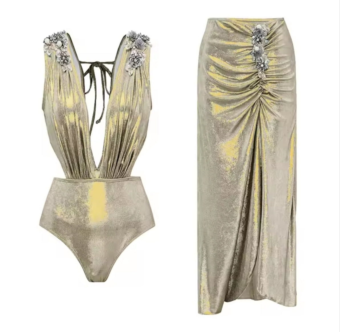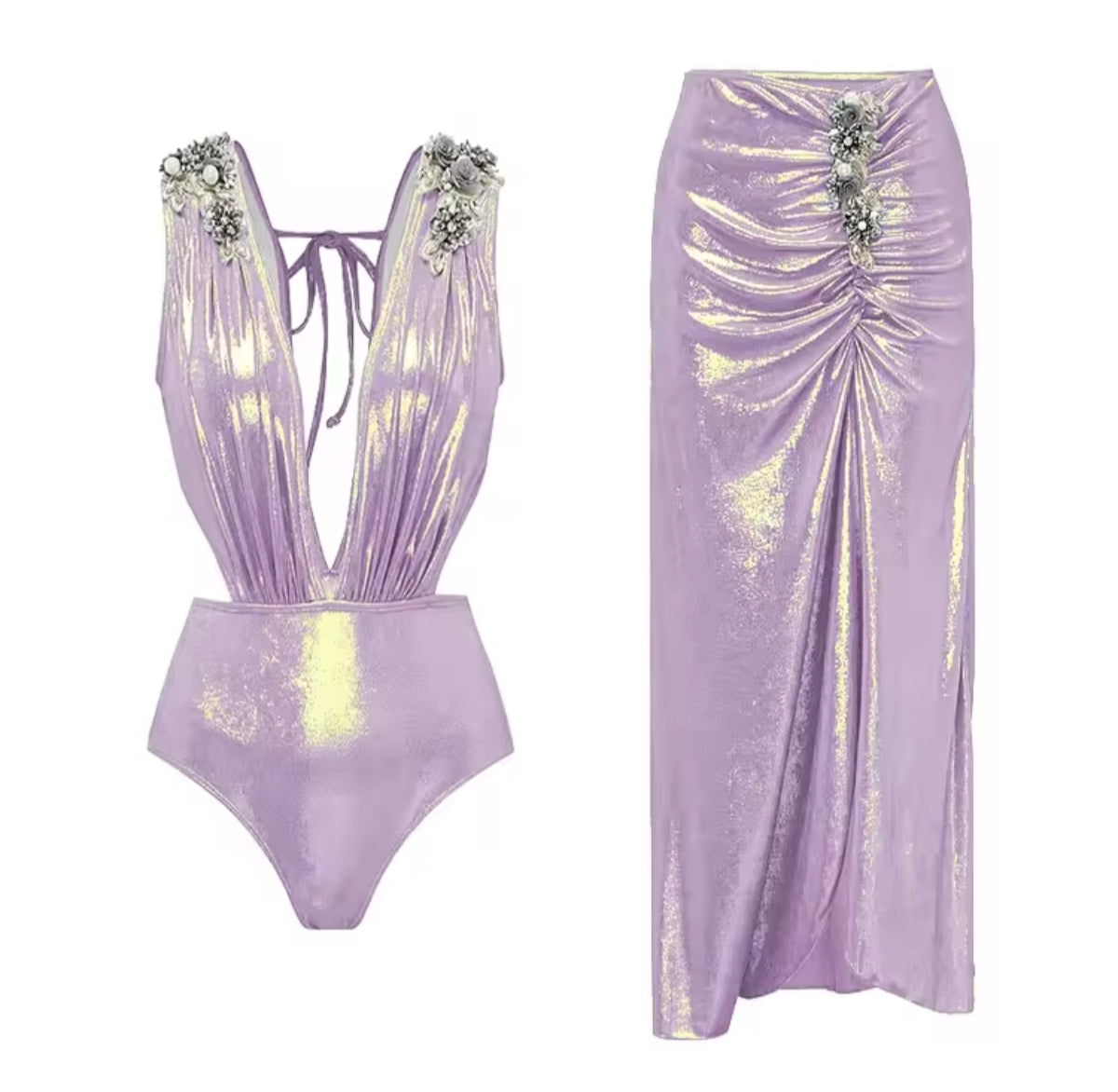 Maillot de bain une pièce métallisé bleu lagon, Rose poudré, Lilas, Doré, Argenté, accompagné de sa jupe drapée assortie. Orné de broderies bijoux étincelantes aux épaules et à la taille, il apporte une allure ultra-glamour, parfaite pour illuminer tes vacances.