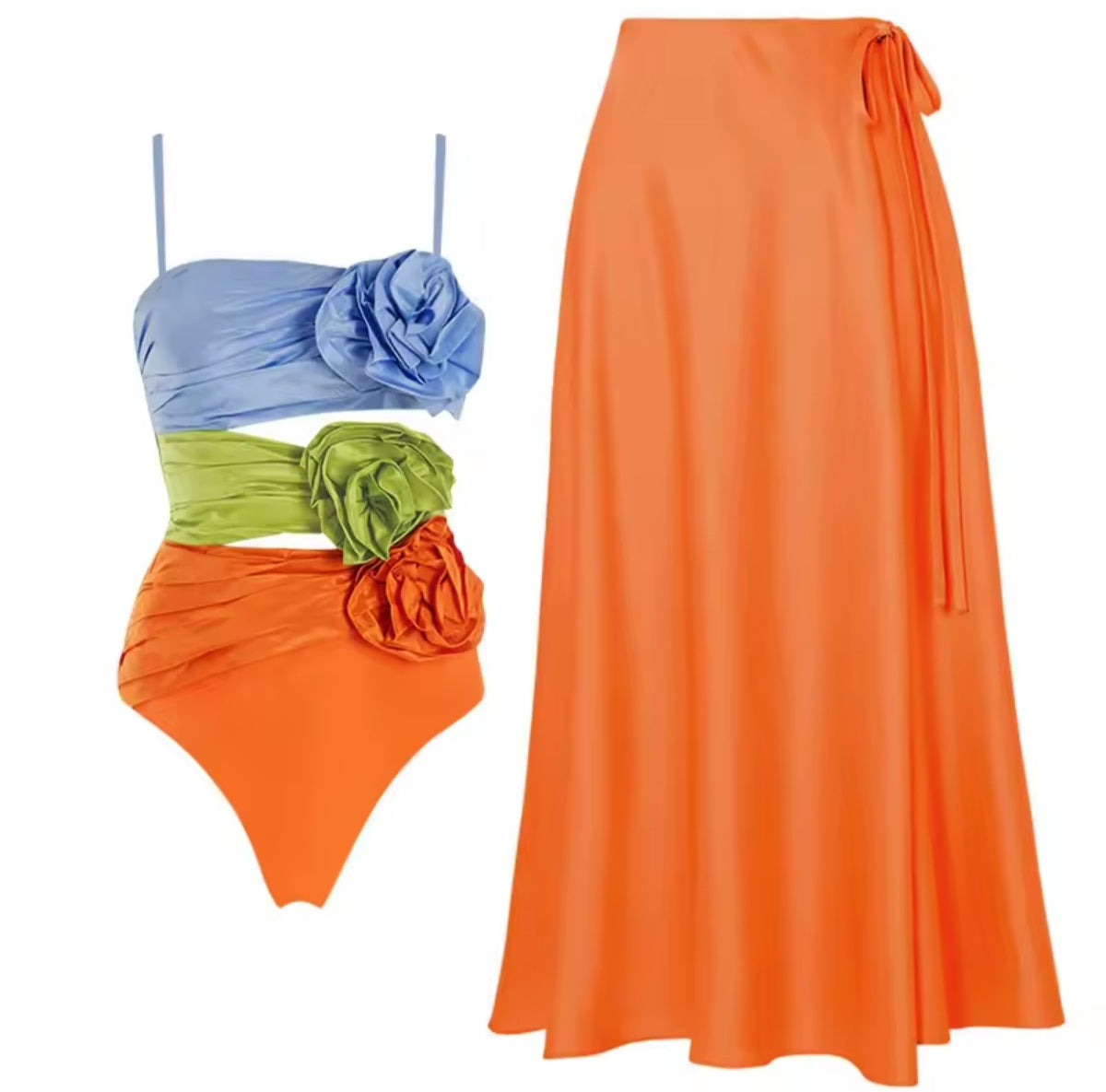 Maillot de bain une pièce multicolore, accompagné de sa jupe orange fluide assortie. Décoré de fleurs volumineuses bleu, vert et orange, il offre un look frais, original et estival. Ce modèle est parfait pour celles qui veulent un style joyeux et chic, que ce soit à la plage ou au bord de la piscine.