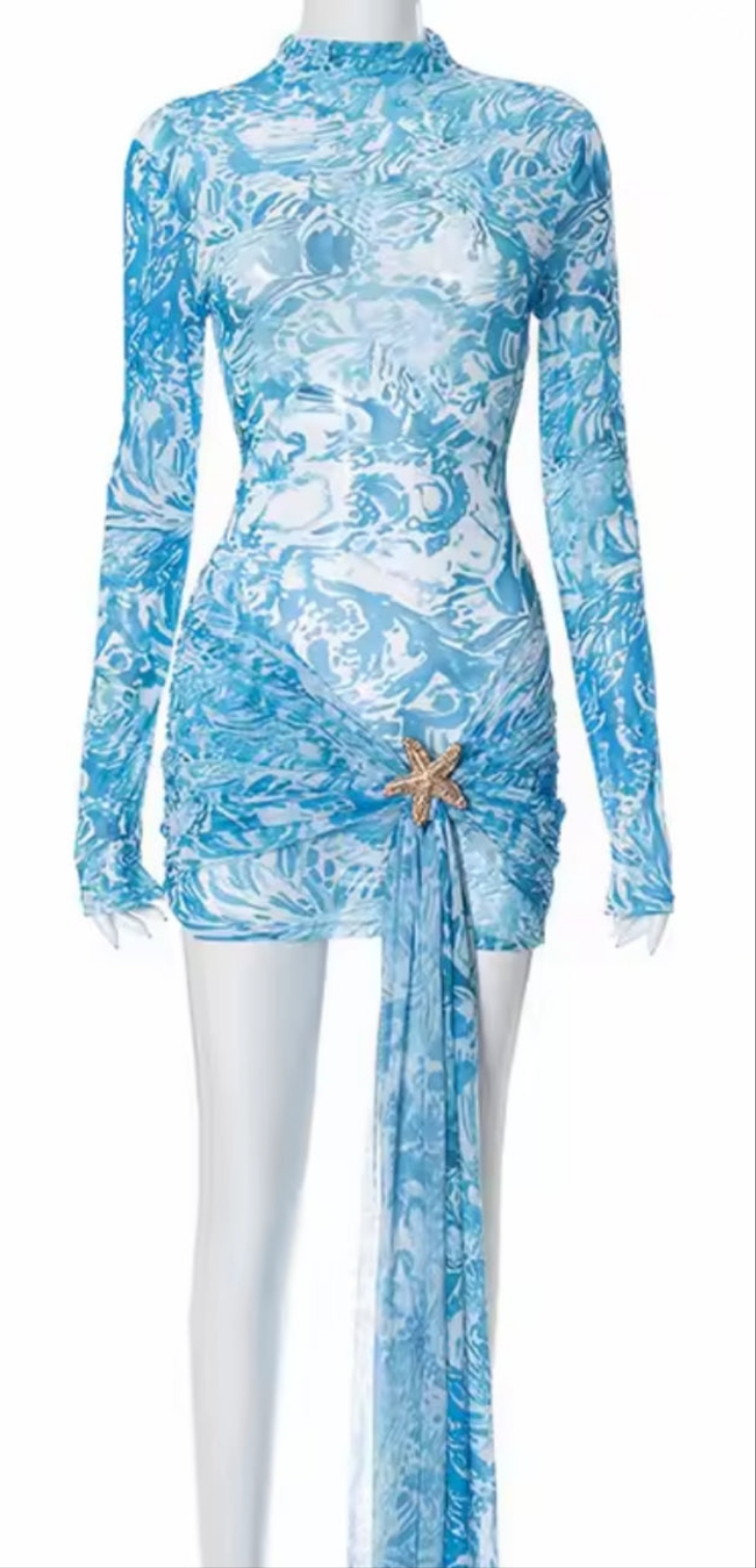 Robe mini manches longues ultra tendance, au motif bleu océan et détail étoile de mer dorée. Avec sa coupe ajustée et sa traîne asymétrique, elle apporte une touche glamour et irrésistible, parfaite pour les soirées d’été et les beach clubs chics.
