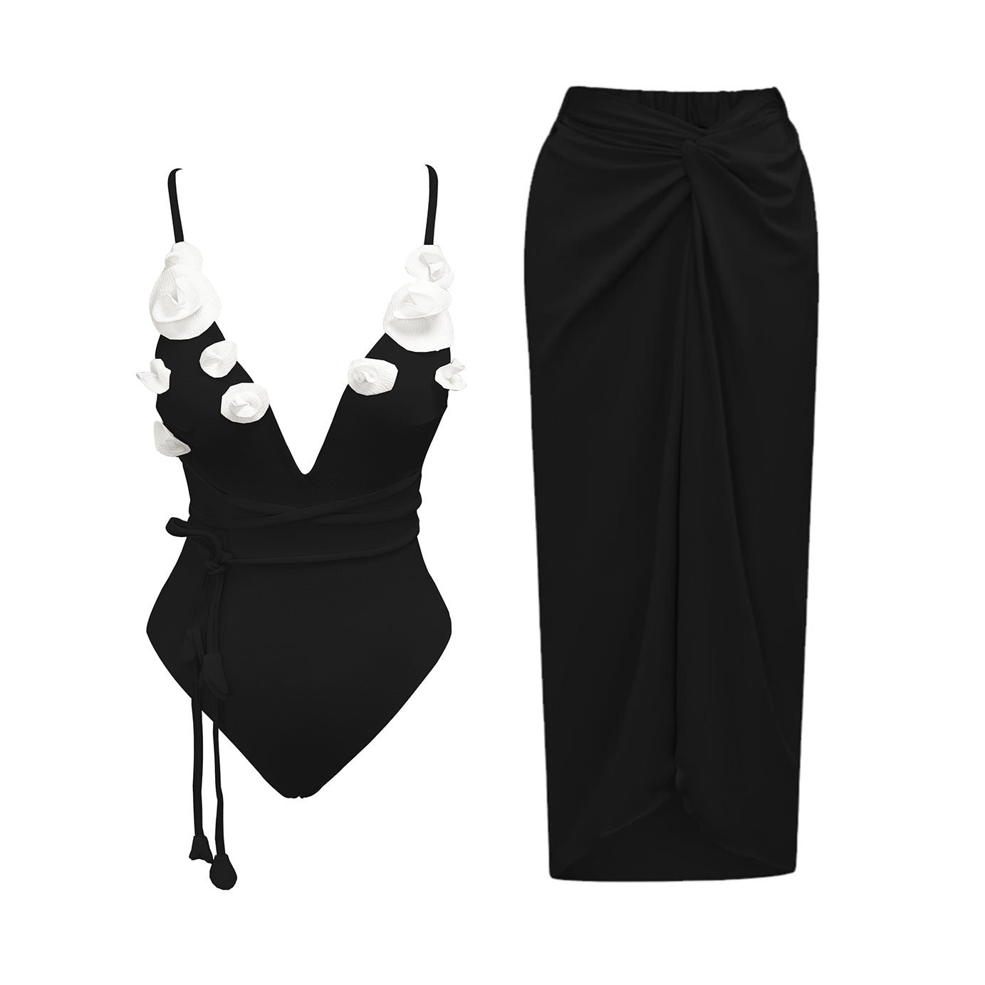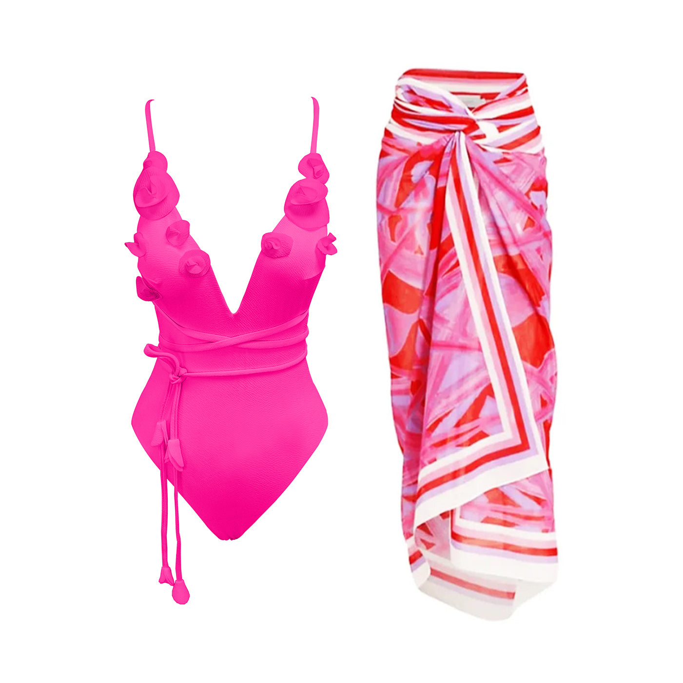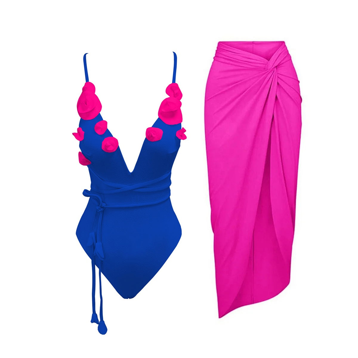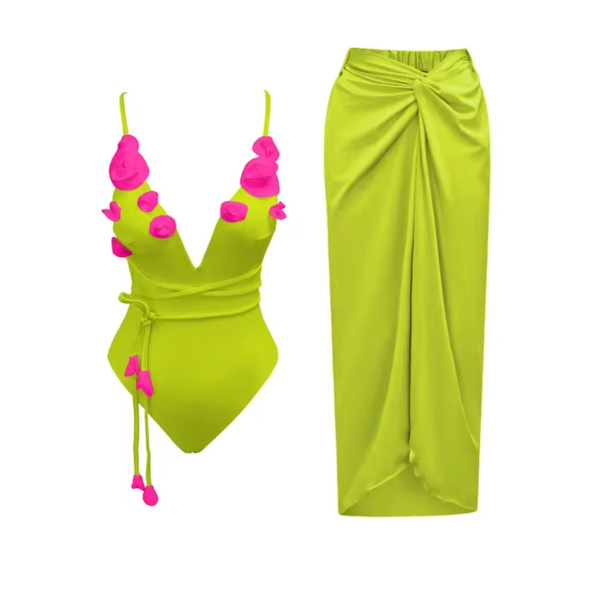 Ensemble 2 pièces ultra glamour : maillot une pièce décolleté plongeant orné de fleurs en relief, accompagné d’un paréo assorti. Disponible en plusieurs coloris vibrants. Parfait pour un look chic et romantique sur la plage ou au bord de la piscine.