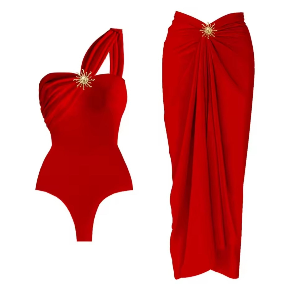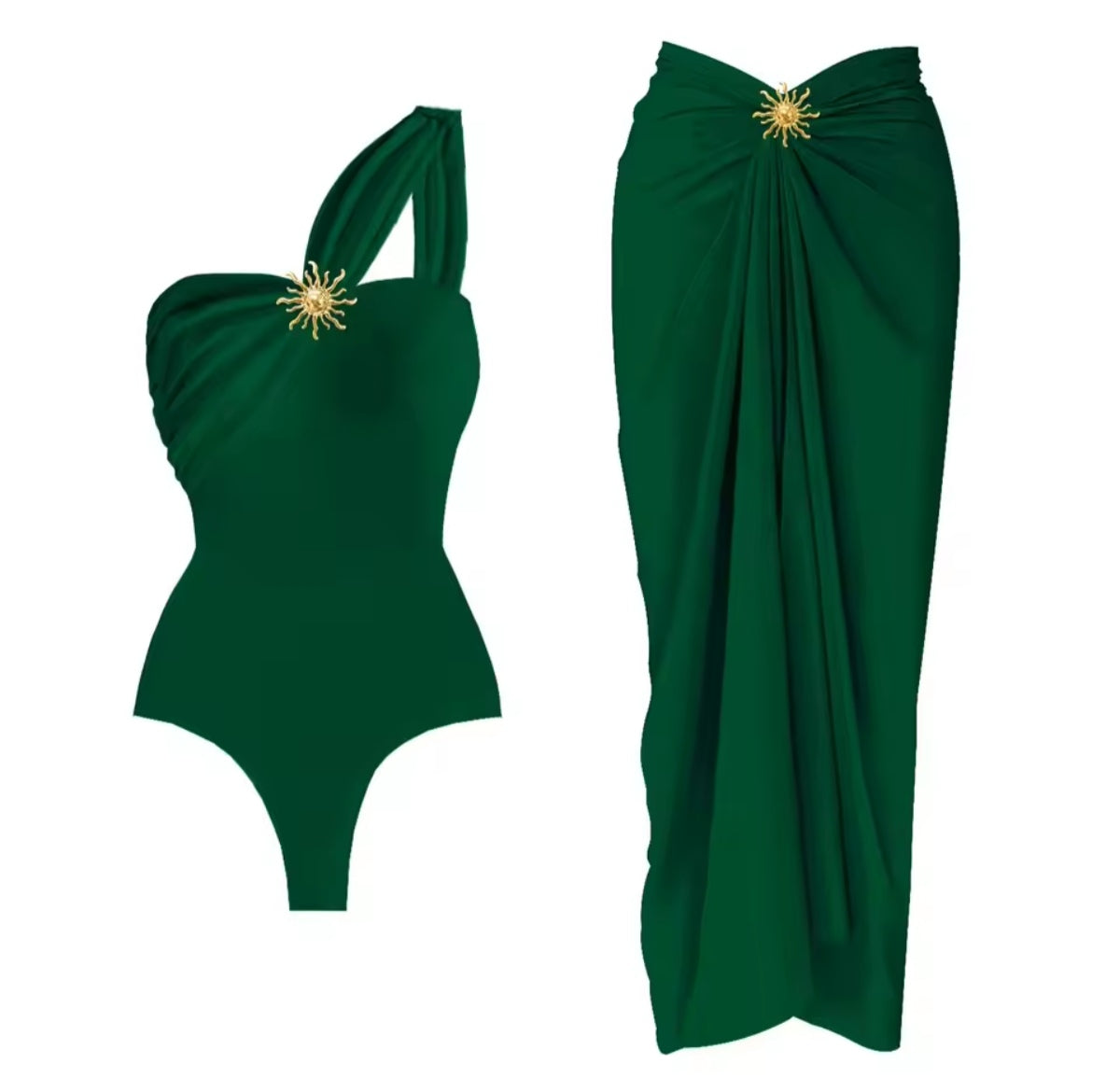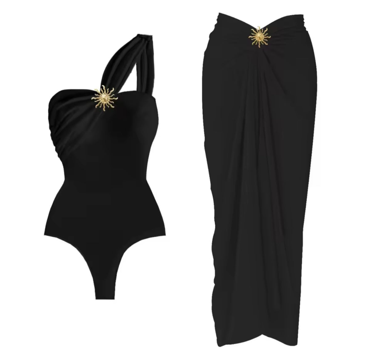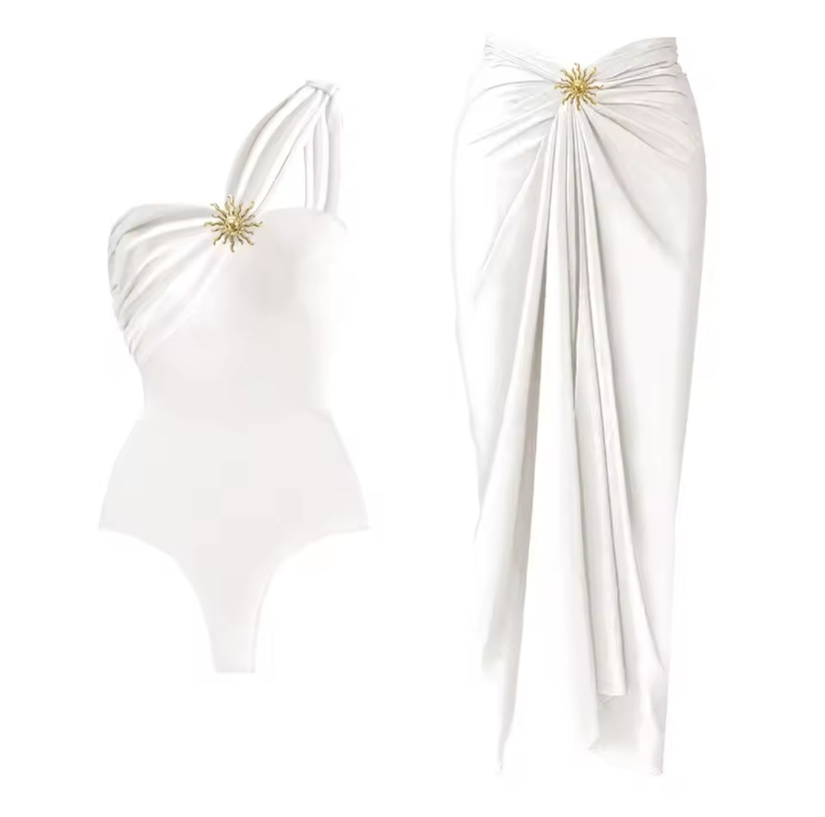 Maillot une pièce élégant avec jupe assortie, sublimé par un bijou doré effet soleil pour un look glamour et raffiné. Son design asymétrique souligne les épaules avec délicatesse, parfait pour briller à la plage comme en soirée.